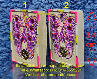 类型 :这是强大的蝴蝶王Thep JamLang与(装式品)(高3.4厘米)由古巴吉沙纳在BE2561在Wat Asromsatan加持。精选神圣的彩色蝴蝶王Thep JamLang与蝴蝶扬持图像和宝石在前面。 额外嵌入神圣 - 九尾巴狐仙牌, 帕四面佛,帕象神和帕比打(各有4支打固) - (并为此批量添加了宝石这个神圣的蝴蝶牌是由''神圣的蝴蝶mong Kao'粉末,一個令人振奮的花香在這個蝴蝶牌。古巴吉沙纳背诵“Thewa Nakri”古代法术。“Thewa Nakri”神奇伟大的善良,迷人和财富。提供防水壳。 我強烈向你推薦。年份 :BE2561